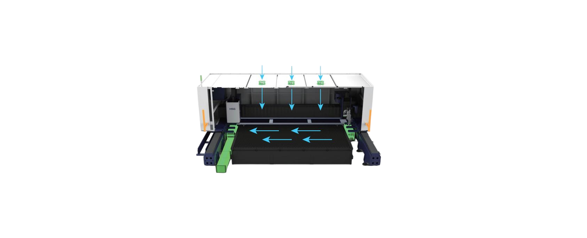 工作臺與床身的分離設(shè)計(jì)能有效隔離熱源,降低大功率激光切割過程中產(chǎn)生的熱量對傳動系統(tǒng)的影響,確保設(shè)備在高負(fù)荷工況下穩(wěn)定運(yùn)行,從而維持高精度與穩(wěn)定性,并延長設(shè)備使用壽命。