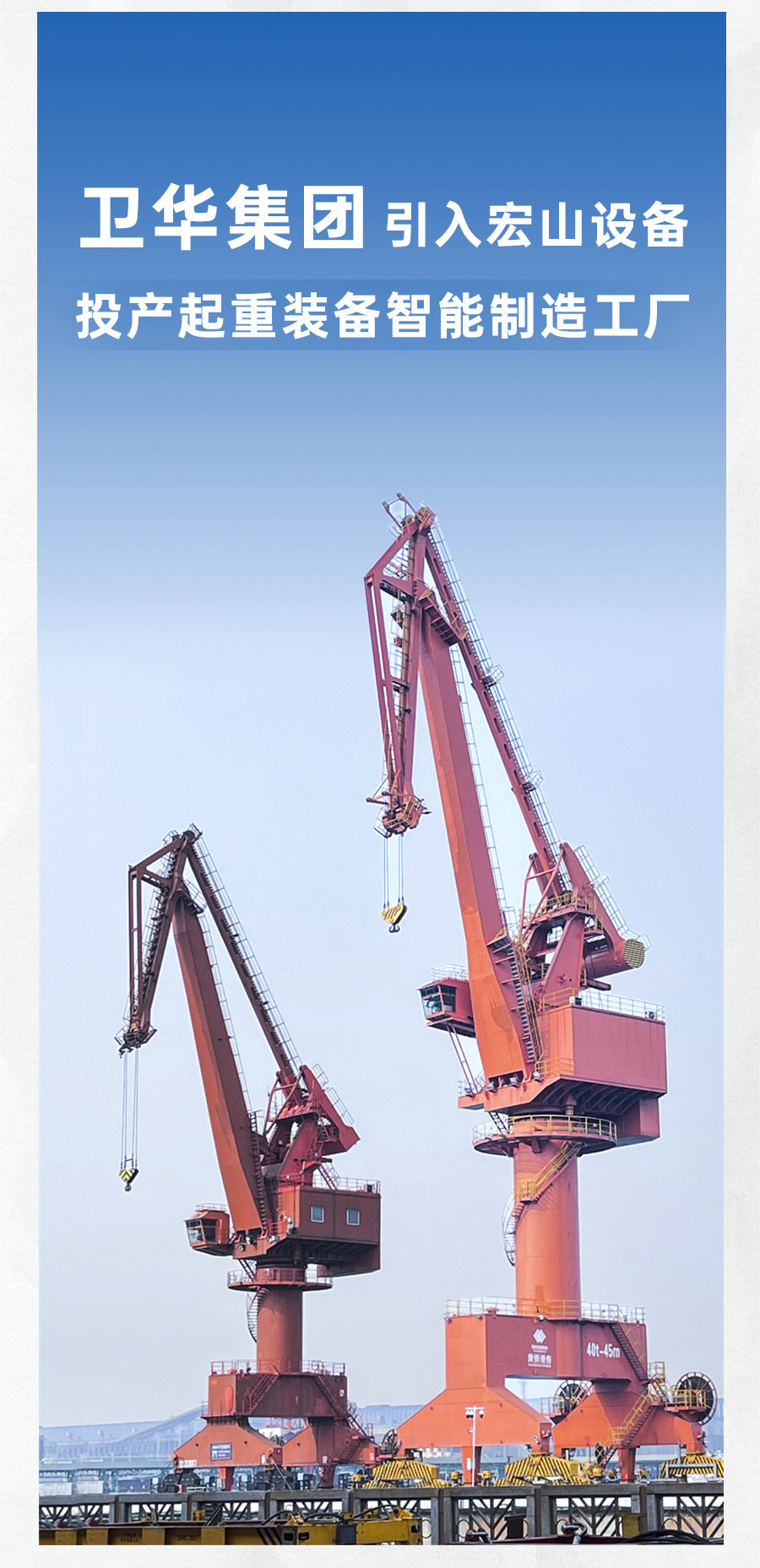 作為專業的起重裝備制造商及系統解決方案提供商,衛華集團在工業起重機、港口起重機、智能停車設備、工業軟件和智能控制等領域,打造了行業內門類齊全、品種豐富的起重產品序列,實現了產品全生命周期管理。作為國內四大衛星發射基地起重裝備承制單位,衛華集團助力神舟系列飛船、長征系列火箭、天宮系列探測器成功飛天,為奧運工程、西氣東輸、南水北調、杭州灣跨海大橋、新一代核電站等國家重點工程保駕護航,其產品銷售至全球130多個國家和地區,形成覆蓋美洲、非洲、亞太、獨聯體、中東、歐洲等六大區域的發展格局。